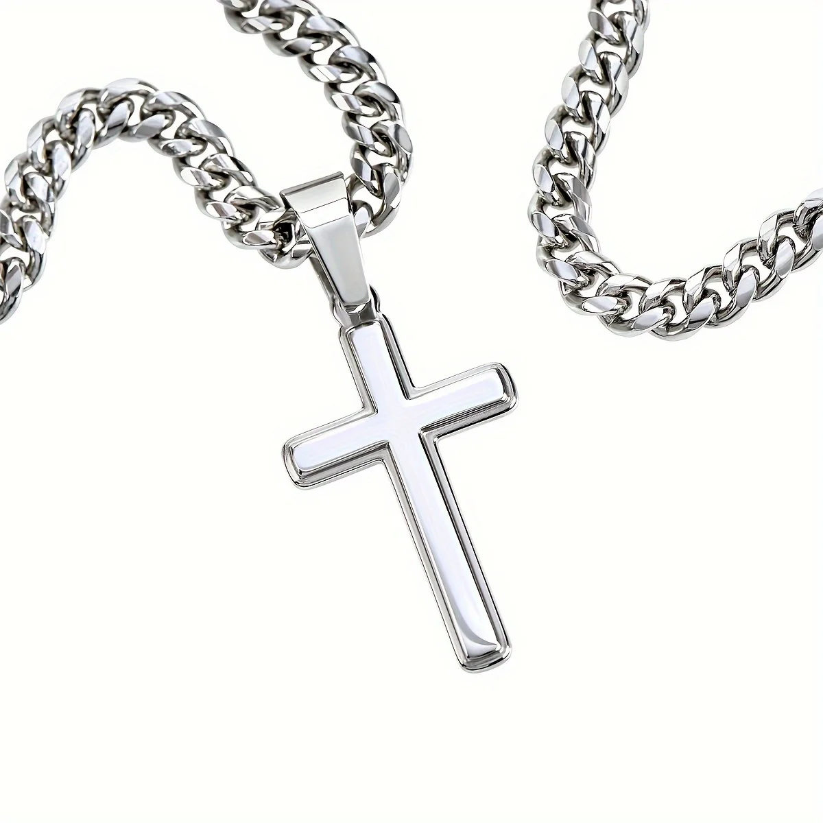 A clean, masculine statement of faith. This stainless steel Cuban chain cross necklace is built to last, with a timeless design that pairs strength with simplicity. A meaningful piece for daily wear or gifting.
